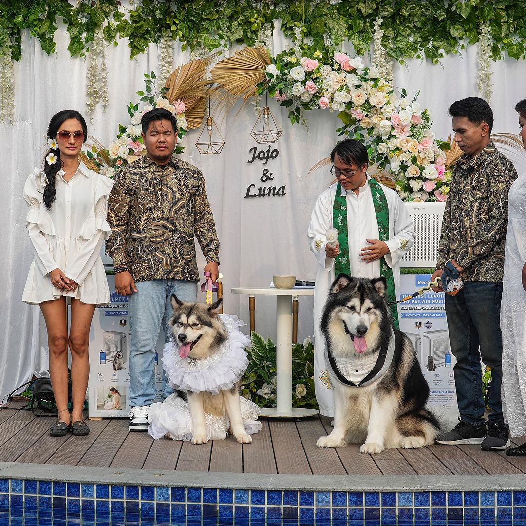 Sepasang pengantin anjing ini mengenakan pengantin adat bernuansa hitam emas. Pernikahan digelar dengan prosesi pemberkatan sepasang pengantin oleh seorang pendeta di depan altar.