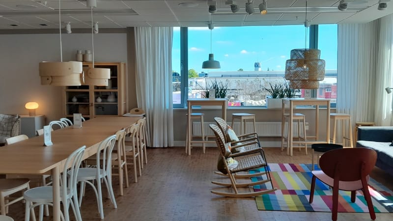 Tata letaknya dibuat sedemikian rupa sehingga menciptakan ruang-ruang komunal yang nyaman dan mendorong interaksi antar tamu. Anda akan melihat area duduk santai dengan rak buku berisi majalah dan buku, sudut dengan fasilitas makanan dan minuman, serta beberapa pajangan produk IKEA terbaru.