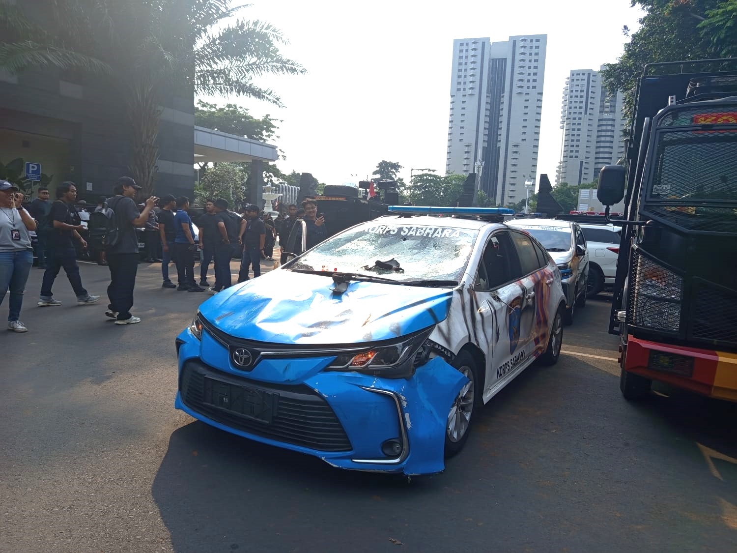 Foto-Foto saat Massa Masuk Halaman Polda Metro Jaya, Rusak Sejumlah Mobil Dinas Polisi