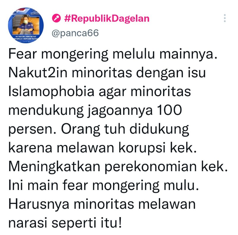"Fear mongering Mulu mainnya. Nakut2in minoritas dg isu Islamophobia agar minoritas mendukung jagoannya 100 persen. Orang tuh didukung utk melawan korupsi kek. Meningkatkan perekonomian kek. Ini main fear mongering mulu. Harusnya minoritas melawan narasi seperti itu," kata Panca melalui @panca66, Kamis (5/5/2022).