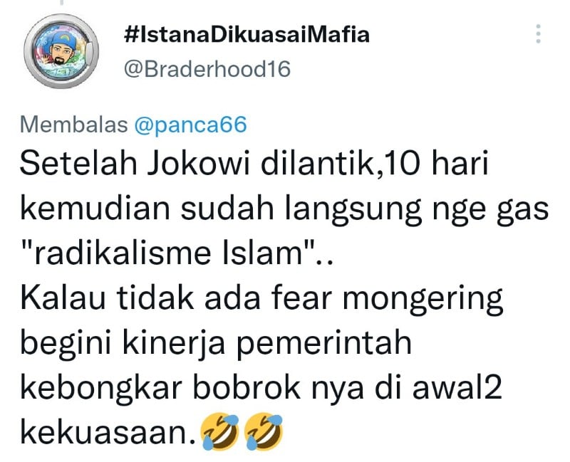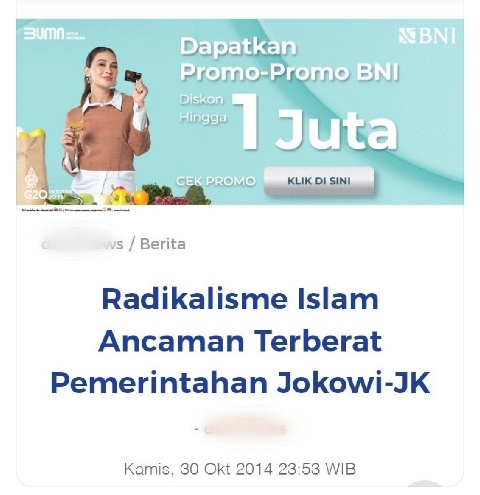 "Setelah Jokowi dilantik, 10 hari kemudian sudah langsung nge gas "radikalisme Islam" ... Kalau tidak ada fear mongering begini, kinerja pemerintah kebongkar borok nya di awal2 kekuasaan.," katanya seraya memposting tangkapan layar dari berita sebuah media online yang tayang pada 30 Oktober 2014.